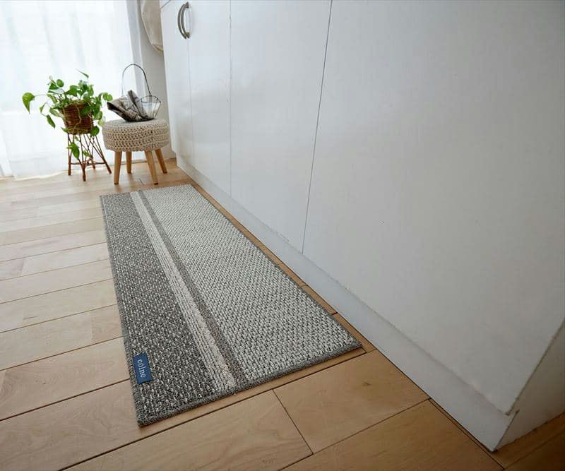麻(リネン)と綿混のやさしい表情のラグマット スッキリとした手触りで、扱いやすくポリエステルを混ぜているのでお手入れもしやすい! 基布もしっかり硬く作られているので、ずれにくく耐久性にも富んでいます。