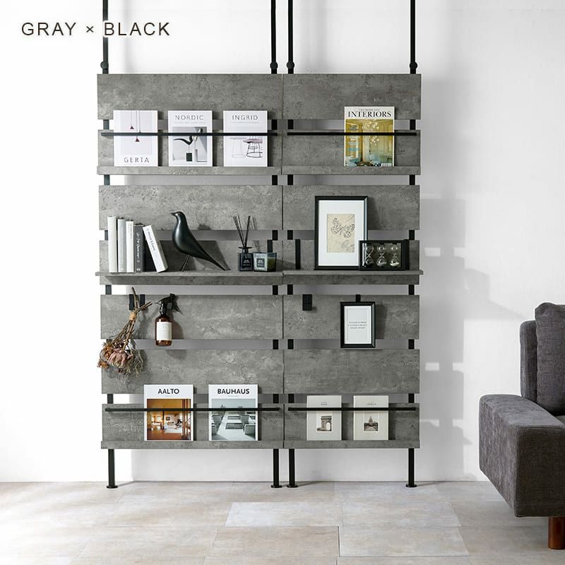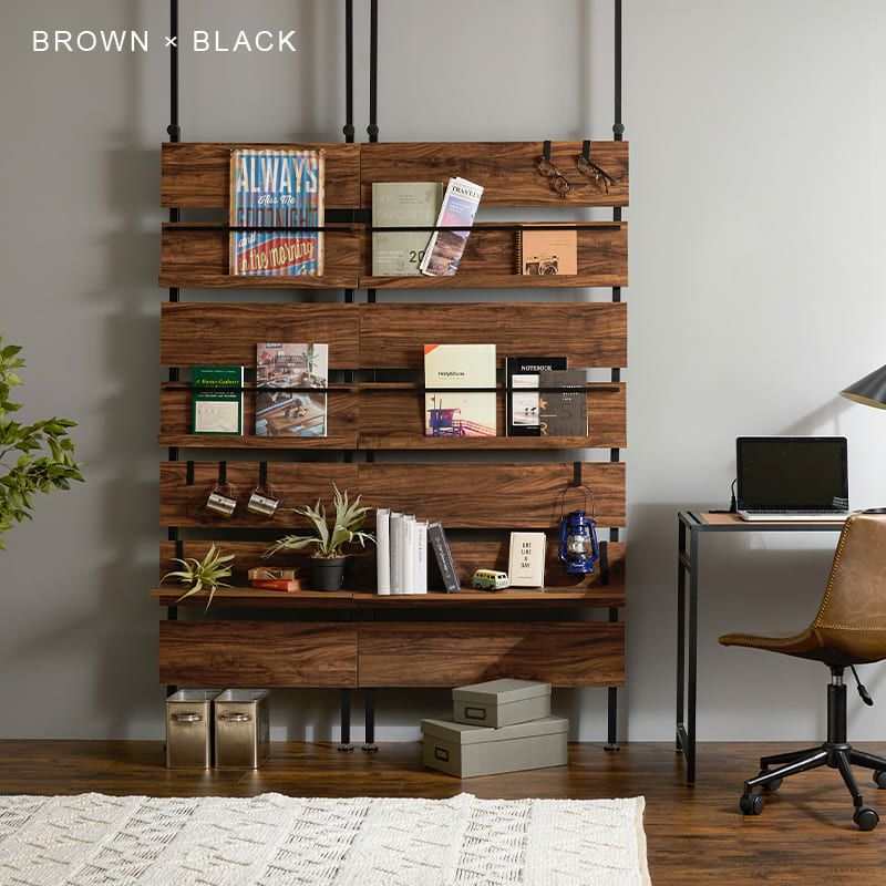 本の表紙をディスプレイできるマガジンラック付きの突っ張り式収納です。棚やフックも付いているのでお好みのレイアウトで使用可能