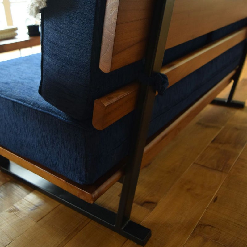 天然木とスチールを組み合わせたデザインのソファ